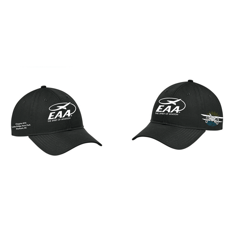 The cap features our official Chapter logo on the front with Chapter 879, Lake Ridge Aero Park, Durham, NC, trimmed in white on one side and Lake Ridge Aero Park's official logo on the other side.